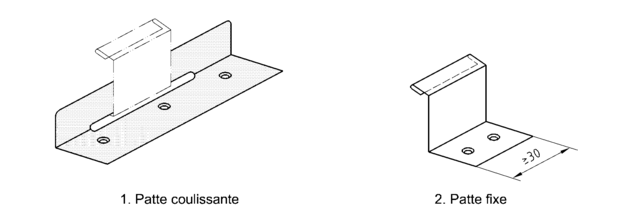 Les bandes sont posées par éléments de longueur inférieure ou égale à 2,00 m. Elles sont fixées à leur partie supérieure à raison de 2,5 fixations par mètre (0,40 m) et maintenues en partie inférieure par des pattes soudées (2,5 par mètre) sur le relevé des feuilles et rabattues sur l'ourlet ou sur la pince (Figures 101 et 102a) ou par des pattes droites soudées sur la partie cachée de la bande porte de solin (Figure 102b). Le recouvrement entre deux éléments successifs doit être de 0,100 m en commençant par le bas suivant le rampant (Figure 102) et en tenant compte des vents de pluie dominants pour les parties horizontales (Figure 62). Les angles rentrant ou sortant sont réalisés par coupe d'onglet et soudés.