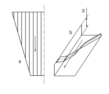 On peut également créer un ressaut par cassure de pente à l'aide d'un coyau (Figure 6), dont la pente respecte les valeurs des Tableaux 4 ou 5. Sur les gradins ainsi établis, on pose les voliges, frises, planches et lames à plancher, comme il est indiqué au paragraphe 5.1.3.1.1.
