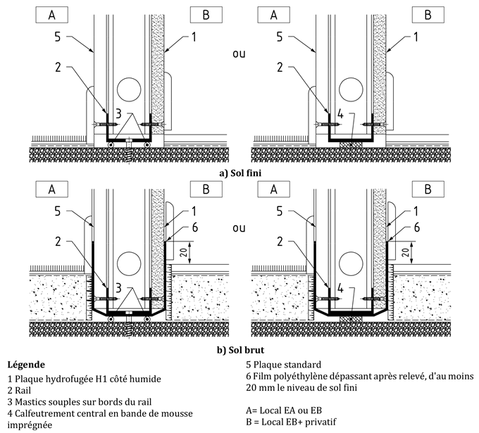 Dans le cas de pose sur sol fini ou sur sol brut, les semelles doivent être protégées soit par un profilé plastique en forme de U soit par un film polyéthylène pour protéger la semelle sur une hauteur d'au moins 20 mm, au-dessus du sol fini. Dans tous les cas, un cordon de mastic sera interposé sous la protection avant fixation au sol des semelles.