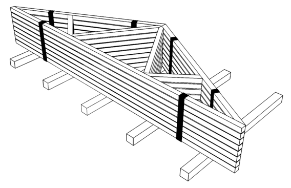 Les fermes sont stockées de préférence verticalement et reposent sur des supports disposés sous les noeuds prévus pour les appuis (voir exemple en Figure 2).