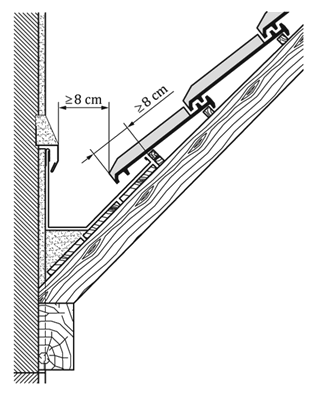 La bande métallique à larmier comporte une pince de tête et le recouvrement des tuiles sur la bande est de 8 cm minimum (Figure 4).